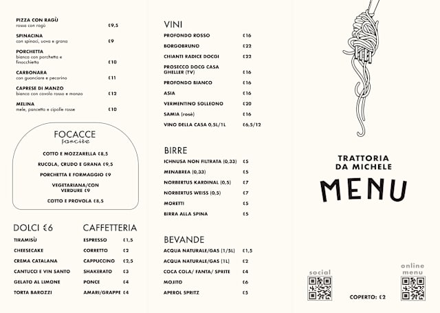 10/10We’ve eaten here a couple times. The food is great. Antipasto - cuts of meat and cheese. Mains - steak on ruca with Parmesan flakes / Cacio e Pepe / penne bolognese/ risotto col pancetta e crema di zuccha dessert - tiramisu/ crema Catalina. 1 liter of red house wine and a couple cans of sprite for the kids. It was fantastic.