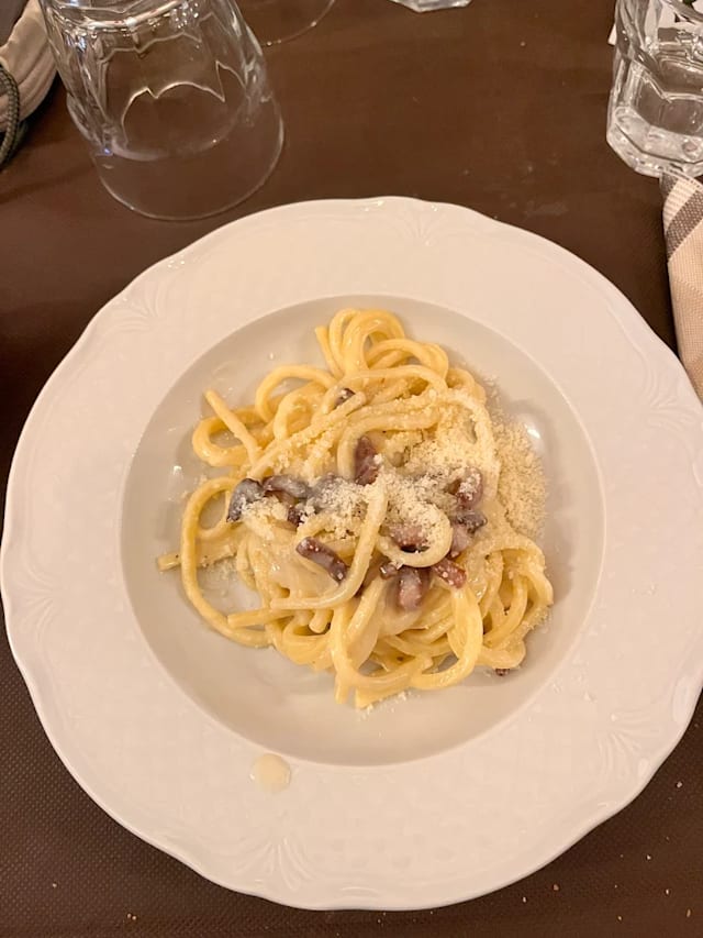 (Pasta secca, uovo, guanciale di norcia, pecorino d.o.p. laziale e pepe)