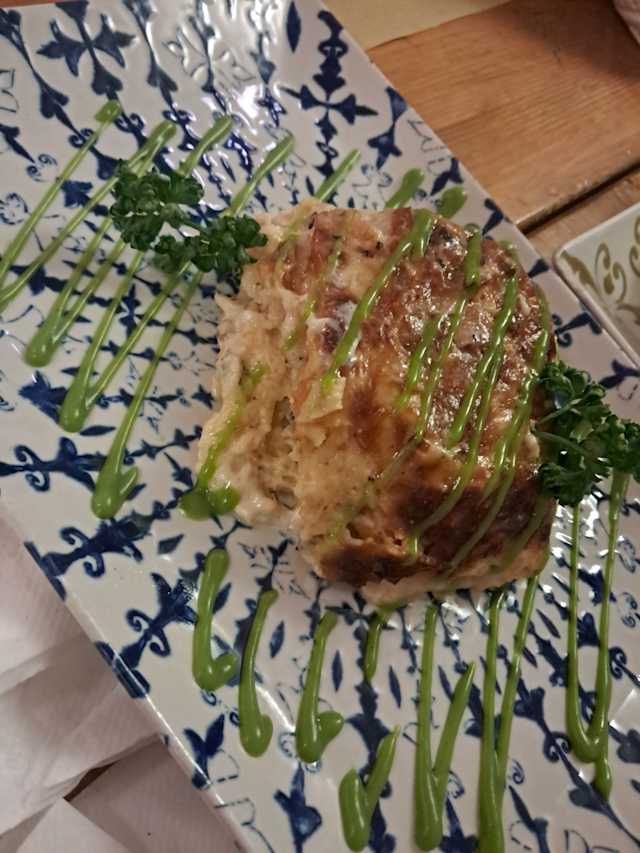 - (Pasta fatta in casa ripiena di ragù di filetto, foduta di pecorino, guanciale croccante)