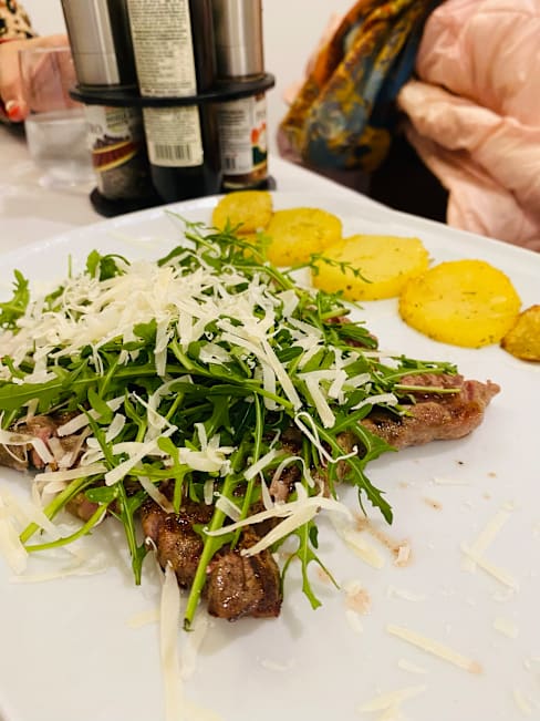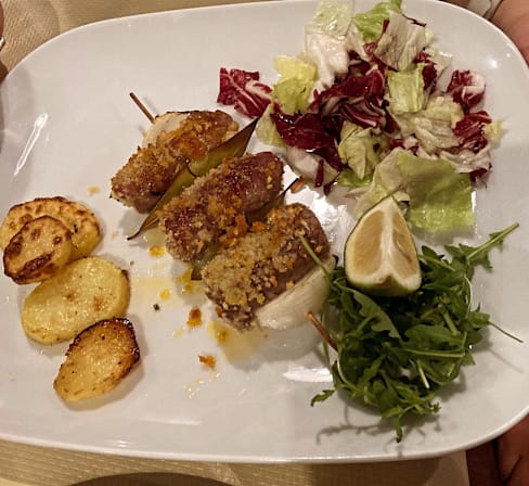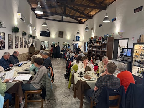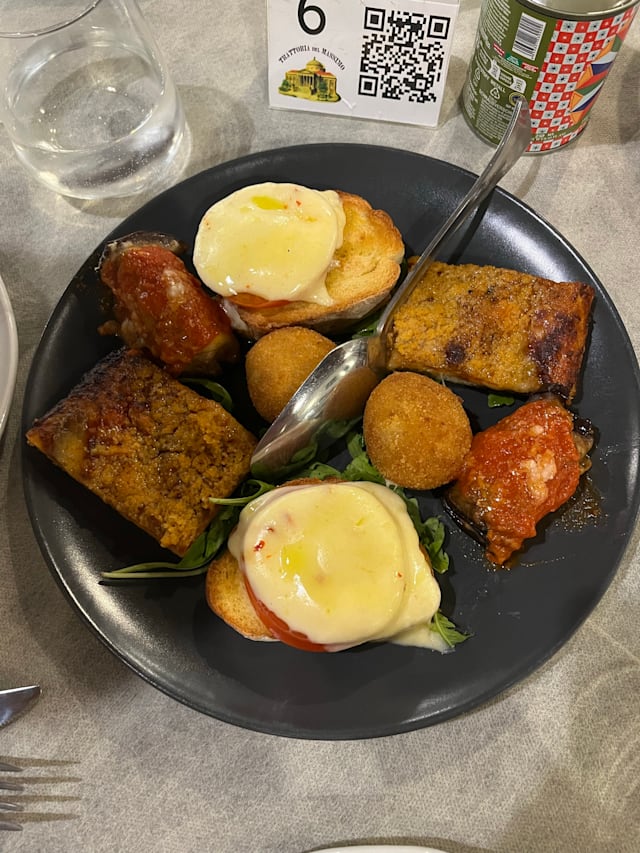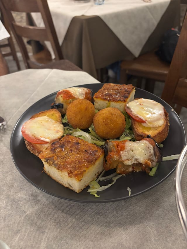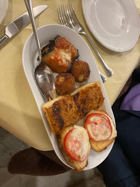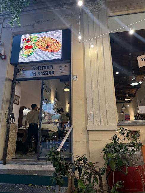 8.5/10+2We are a group of 9 visiting Palermo and Trattoria del Massimo is a spacious restaurant with good food & service to accommodate groups. To start we had panelle & crocche, caponata and bruschetta. For mains we had Sicilian swordfish rolls, meat rolls, risotto cooked in Nero D’Avola and pizza. For dessert: lemon sorbet, a ricotta torte and almond parfait. For wine: Tenuta Orestide’s Nero D’Avola and Baglio Di Pianetto’s Insolia.