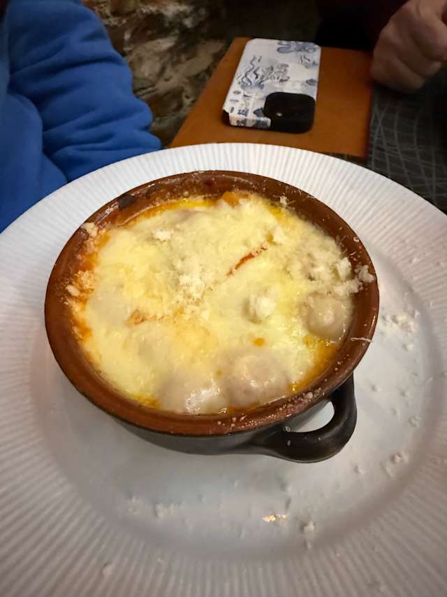 - Gnocchi di patate in salsa di pomodoro, mozzarella filante e basilico fresco, gratinati al forno