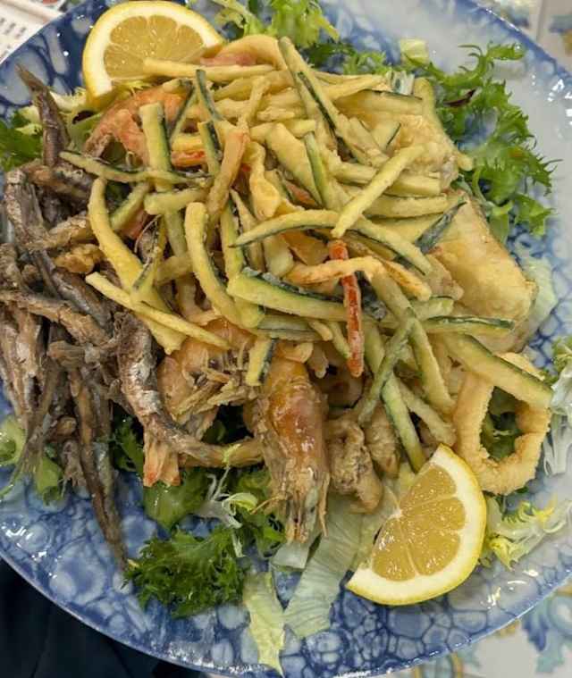 - Gamberi, calamari, alici fritte e tocchetti di baccala’