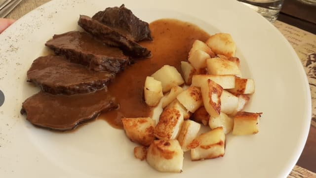 Guanciale di manzo cotto a legna con contorno di patate