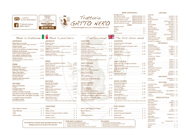 10/10My wife and I went to Gatto Nero on a cold, rainy night. Although Americans, we speak Italian and were welcomed warmly. We noticed immediately that the staff was comfortable with the multiple languages spoken by guests, this being a touristic town, and always helpful. The restaurant space inside is cozy and everyone is really nice. The food was excellent and fairly priced. We shared a plate of vegetables from the oven as an antipasto and then each had a primo. I ate spaghetti with claims and my wife had a stuffed pasta with ragu. The food was presented well. The wine list is short and fairly priced. This is a lovely local place that should be appreciated.