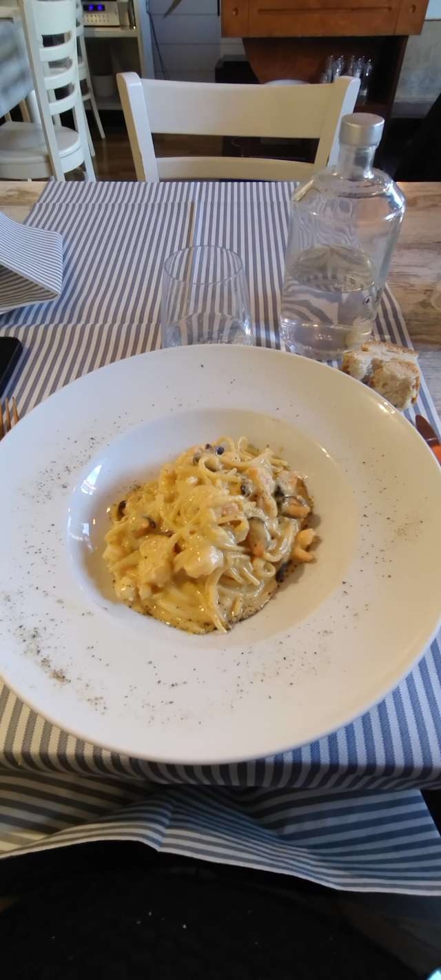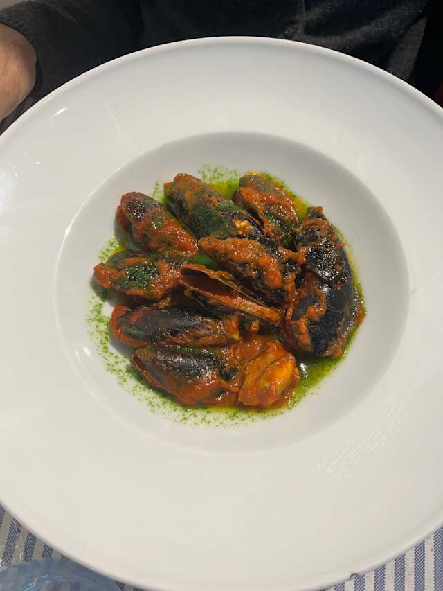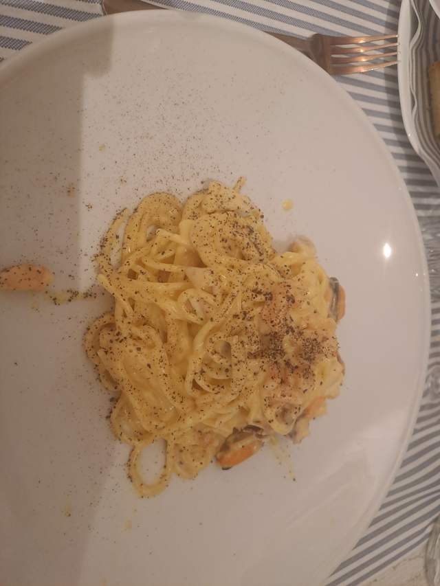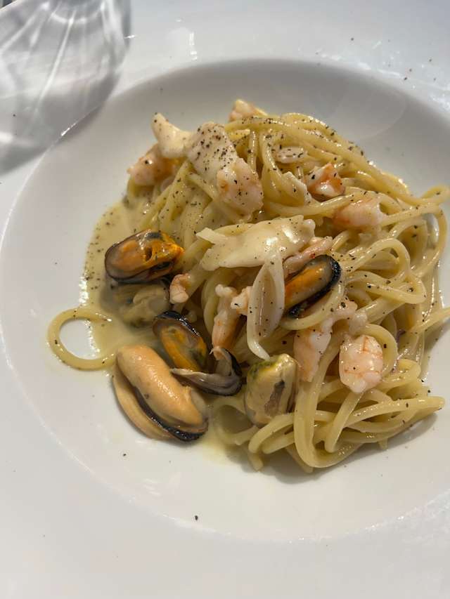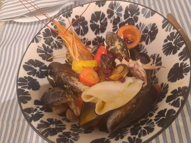 - Tagliolini nero di seppia burrata e tartare di gambero