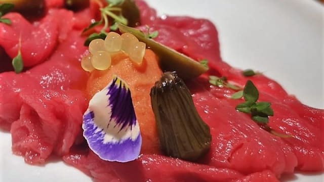 - Battuta di manzo, pane carasau, maionese ai capperi, erbe aromatiche