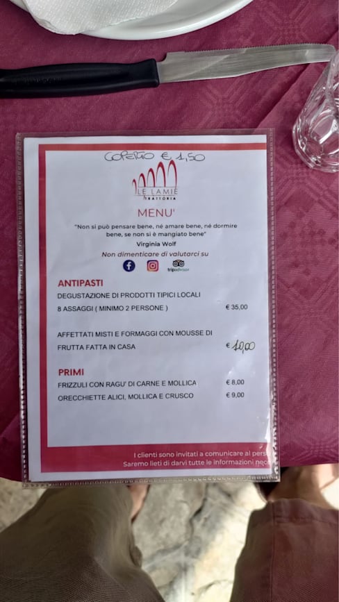 10/10An amazing experience! You could feel with how much love the owners were hosting us, we felt like part of the family. The location is stunning and very romantic. The service impeccable and the food great. We ordered a “Degustazione di prodotti tipici locali” that allowed us to try 8 different typical food of the region, of which the Peperone Crusco is the king! We took also a second course (lamb) and the dessert: a sorbetto with real pieces of lemon, a bless during the warm day. We will definitely come back and we suggest everyone to make a stop at trattoria Le Lamie.