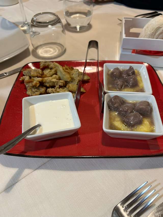 - Tartare di gambero del mediterraneo su crema di fagioli borlotti e gocce di squacquerone