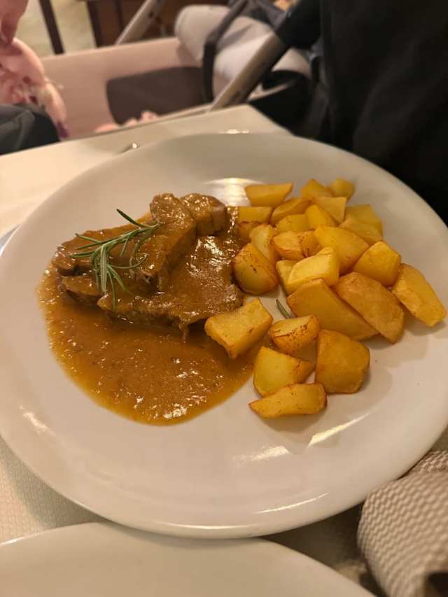 - Arrosto di reale di vitello servito con patate al forno e la sua salsa