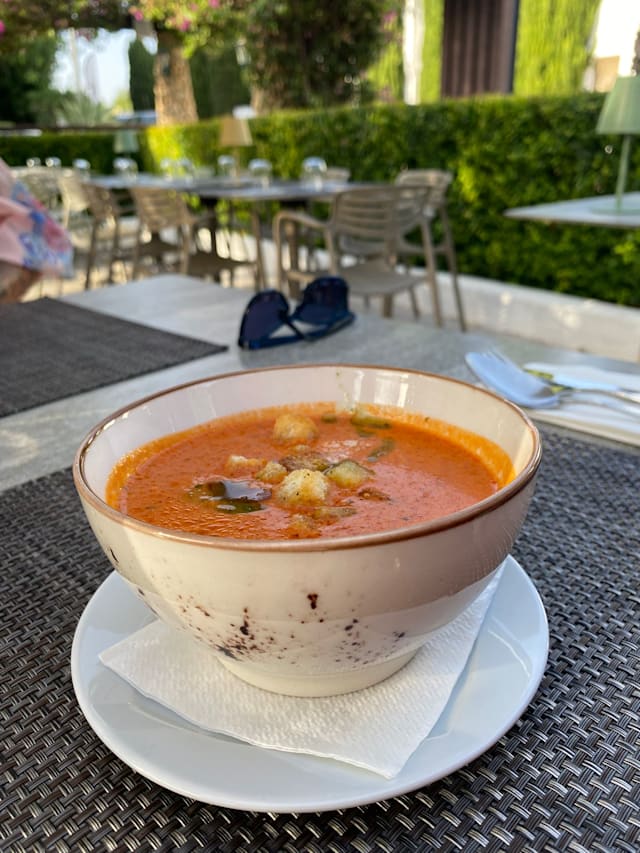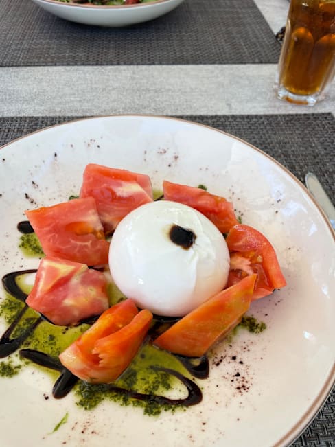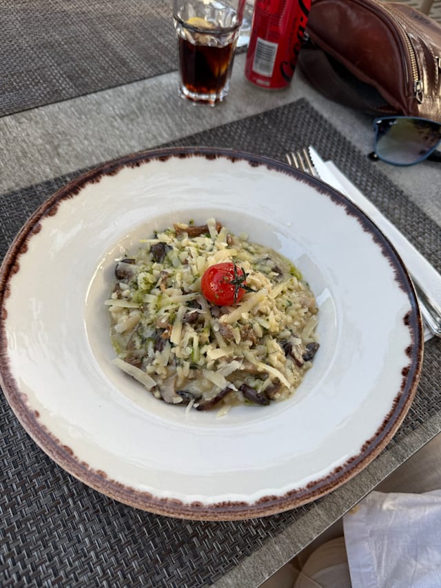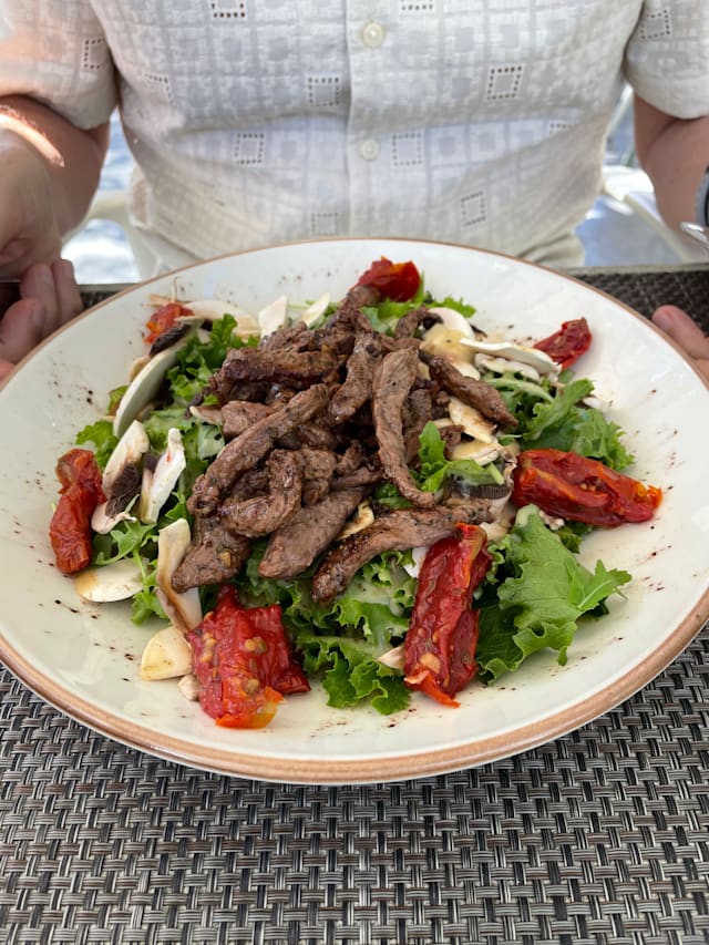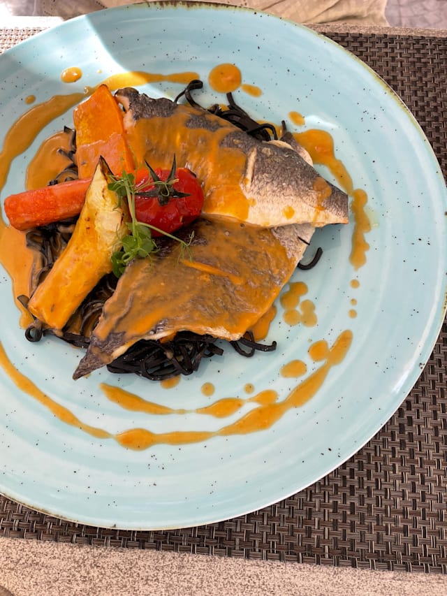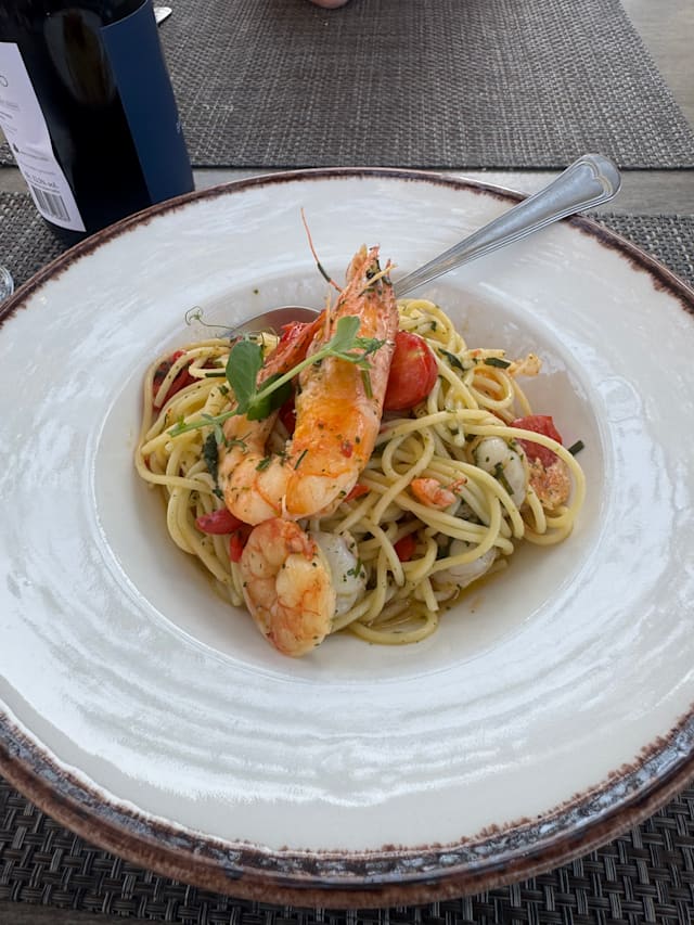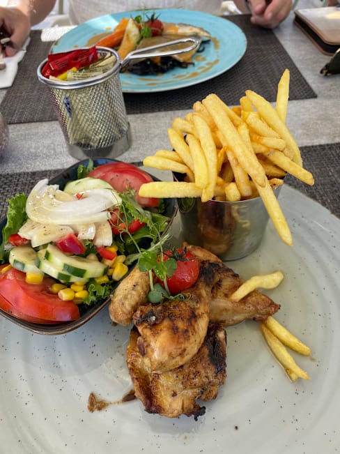 10/10Beautiful setting and great low key music. Out waitress was very friendly. I had Burata and luscious tomatoes, my husband had a country salad which had strips of steak and salad stuff. Then piping hot Piri Piri chicken with crisp fries and a delicious side salad, whilst my husband had sea bream with black spaghetti and a sauce that was made with seafood. Two coffees and lemon teas.
