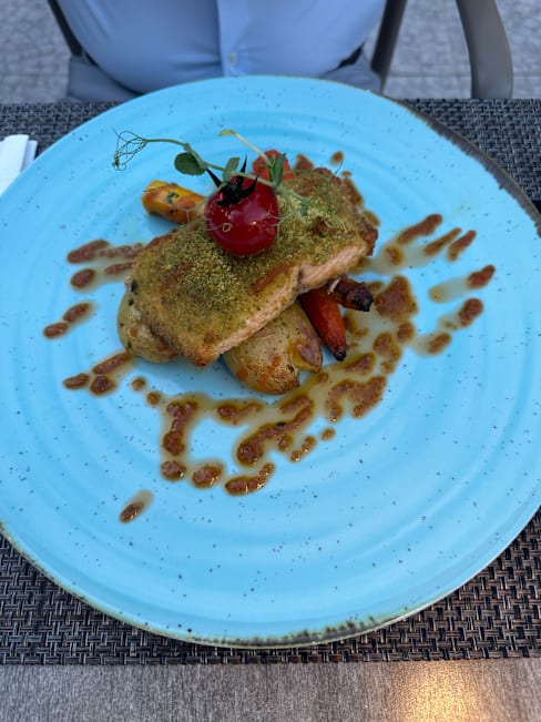 10/10Beautiful setting and great low key music. Out waitress was very friendly. I had Burata and luscious tomatoes, my husband had a country salad which had strips of steak and salad stuff. Then piping hot Piri Piri chicken with crisp fries and a delicious side salad, whilst my husband had sea bream with black spaghetti and a sauce that was made with seafood. Two coffees and lemon teas.