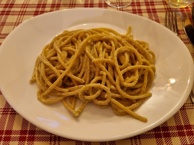 8/10I've already been there and have already come back: it is a reliable, tasty trattoria of traditional Italian (mostly Southern) cuisine. This time "spaghetti allo scoglio" with the good sparkling white wine of the house. Top it all with a spirit: Amaro Silano or Capoblanco