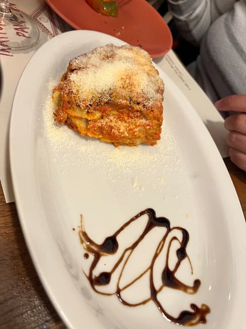 5.5/10Melanzane Parmagiano was warmed up in the microwave as the bottom inner part was cold. Side of potatoes were nice.. again microwaved as they weren’t crispy. Partner enjoyed his swordfish pasta. The discount was only applied to the food and coperto. Not the drinks (or pizza).