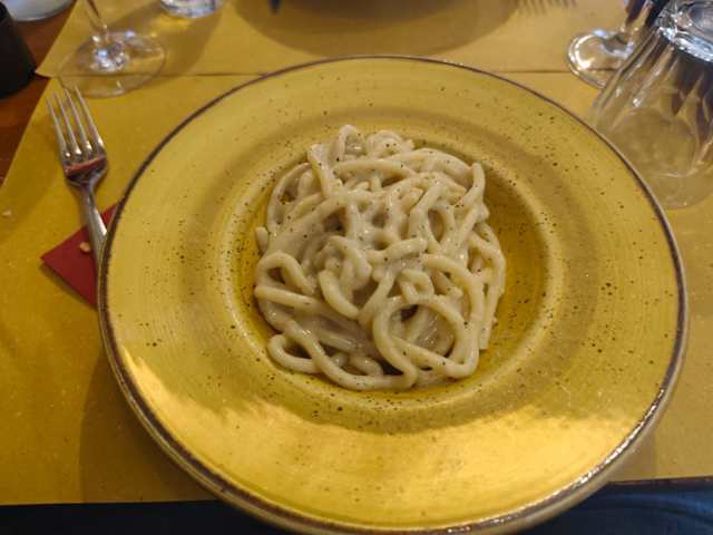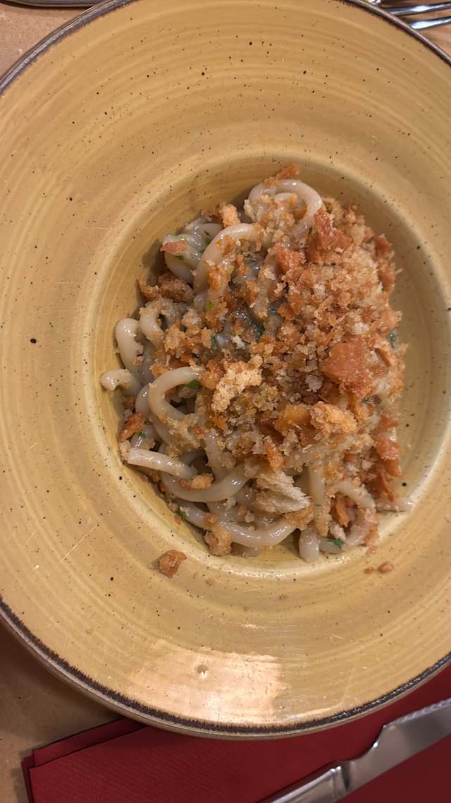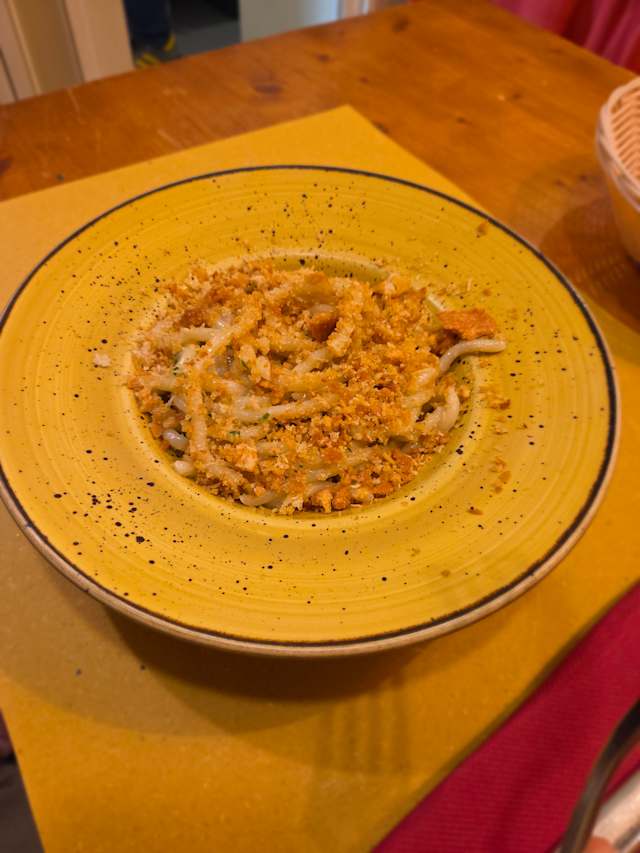 Tipici spaghettoni fatti in casa saltati in salsa di aglio, olio, briciole e filettini d’acciuga