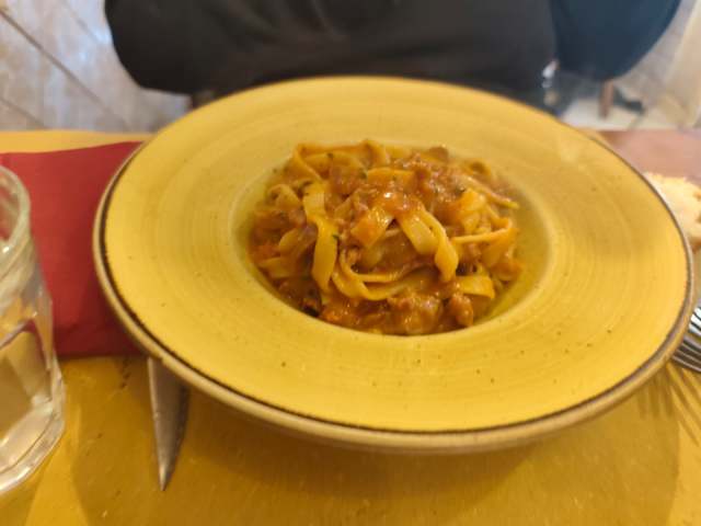 Tipici spaghettoni fatti in casa con pesto all’etrusca, sugo di carne e prosciutto crudo