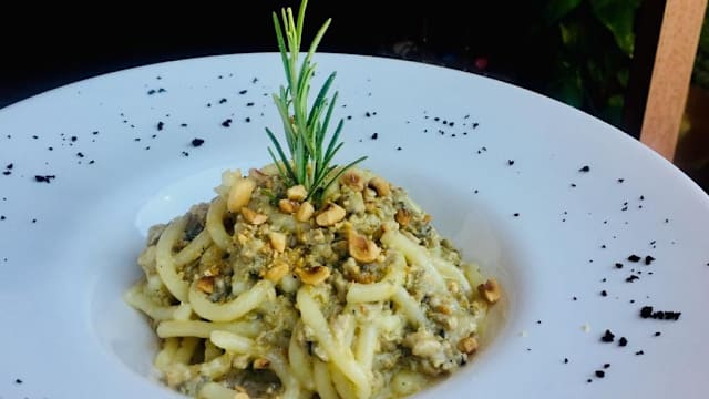 - Pici di pasta fresca al ragù bianco di cinta senese profumato al rosmarino