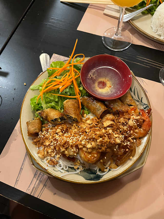 - Salada de massa de arroz com carne de vaca e rolinhos de primavera