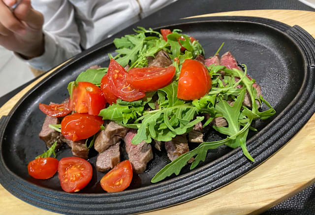 Tenera battuta di fassona, tagliata al coltello per preservarne la naturale morbidezza e il gusto autentico, accompagnata da scaglie di pregiato grana padano stagionato