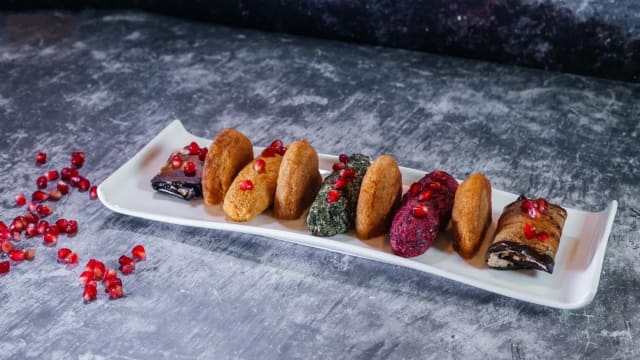 Polpette di verdure miste con salsa di noci, rotolini di melanzane ripieni di salsa di noci
