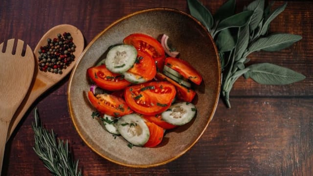 Pomodori, cetrioli, peperoni, cipolla e coriandolo