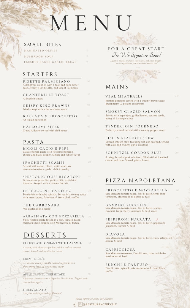 9/10Tre Valv offers a truly authentic Italian dining experience that's sure to delight any food lover. The standout dish for me was the mushroom soup – soulful, warm, and bursting with flavor. Each spoonful was a comforting embrace, perfect for a chilly evening. I couldn't get enough of it! The truffle fettuccine was another highlight of the meal. Divine is the perfect word to describe it. The rich aroma of truffle combined with perfectly cooked pasta created a heavenly combination that left me wanting more. Overall, Tre Valv exceeded my expectations with its impeccable service, cozy atmosphere, and, most importantly, delicious food. Whether you're a fan of classic Italian cuisine or looking to explore new flavors,