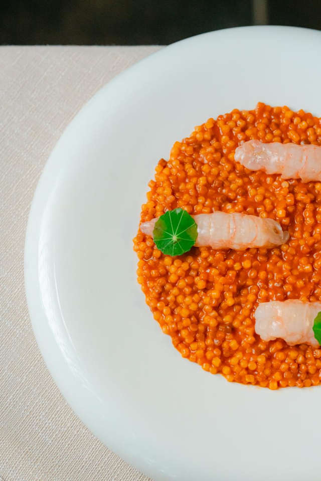 - Scampo crudo, elisir di pomodoro, granita di ostrica e foglia di cappero