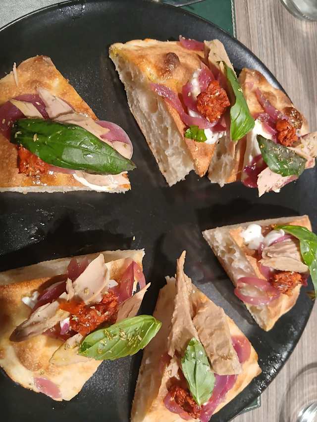 - Filetto di tonno, cipolla di tropea caramellata, mozzarella di bufala, ‘nduja, olio EVO bio