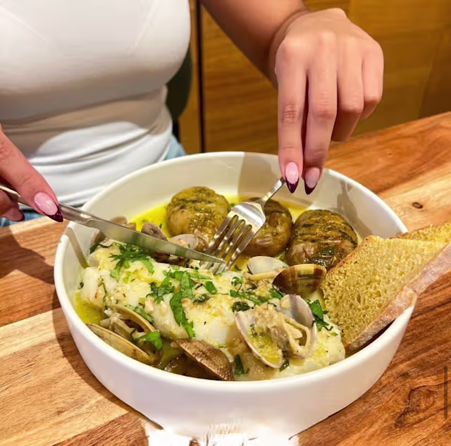 - O bacalhau que nunca falta, feito com azeite extra virgem, o alho certo, as amêijoas que perfumam o prato e a conversa de quem não tem pressa