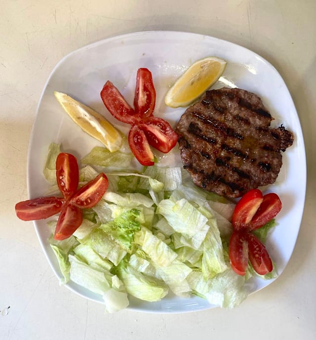 - Hamburger di manzo arrosto con contorno di patatine o insalata