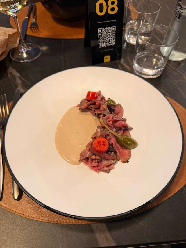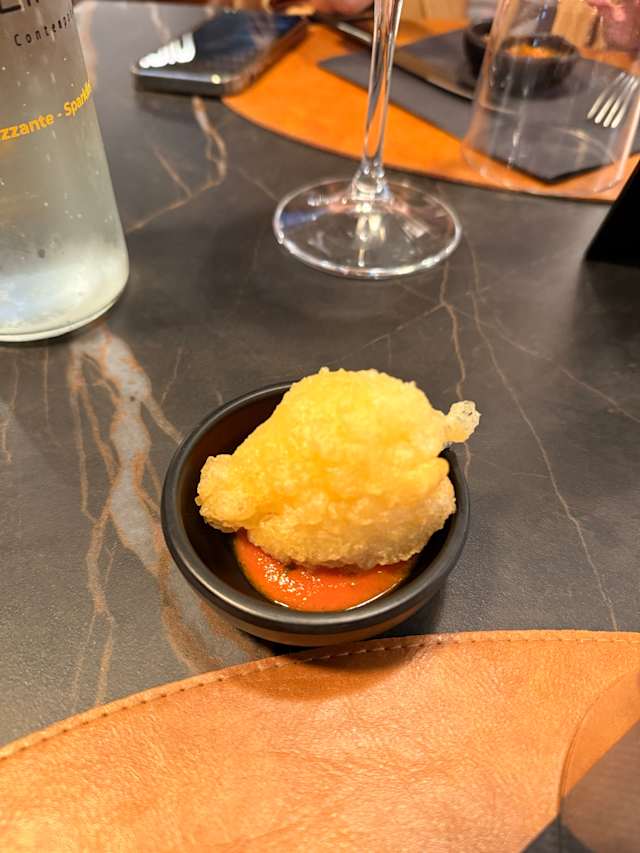 9.5/10The restaurant is not well labeled, I had to ask if it was where we had booked a the signage outside is different We sat inside, which is an area of modern decor spoiled a bit by a big screen flicking photos of the menu items The service was excellent with lots f help with the menu and the choice of wine, which were both excellent We had a bread and tomato mix as an amuse buchee. For starters I had a shrimp dish and my wife a suasage and cabbage mix. For mains I had a seafood pasta and my wife chicken with red peppers and to finish we had delicious milk pudding with caramel and salt crystals The food was truly delicious and we really enjoyed the evening
