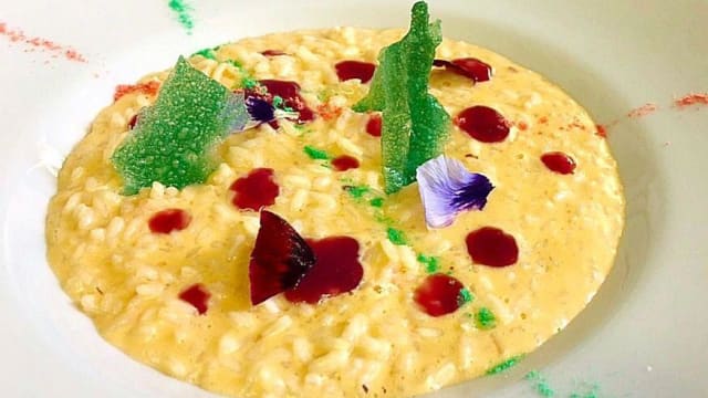 Risotto al gambero , burrata e riduzione al vino fragolino