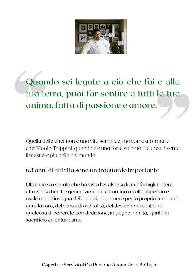 10/10We enjoyed an exceptional lunch at this charming restaurant. It is Michelin recognised and recognised by the Italian chefs association. This small family restaurant, owned and operated by generations since 1964, has beautiful views of the lake below. We did the ala carte menu. My wife loved the artichoke starter. We had the venison, our friends had the pigeon and loved it. The spice cake chocolate dessert was amazing. We had a beautiful local red wine, highly rated on Vivino and reasonably priced. The host, Luca, is the brother of the chef, Paulo Trippini, the bar next door is operated by their sister.