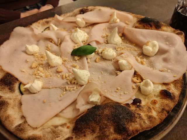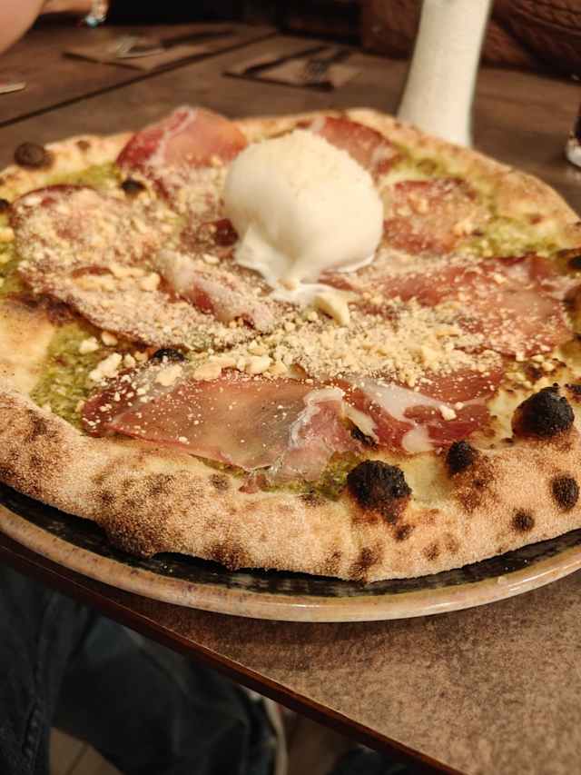 - Crema di pistacchio, mozzarella fior di latte, gorgonzola e pomodori confit