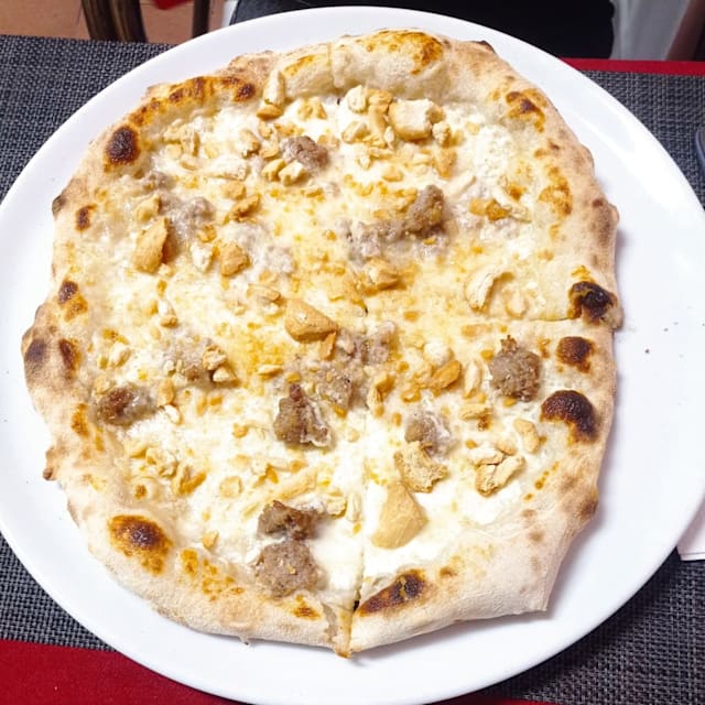 Pomodoro, mozzarella, salsiccia e funghi porcini
