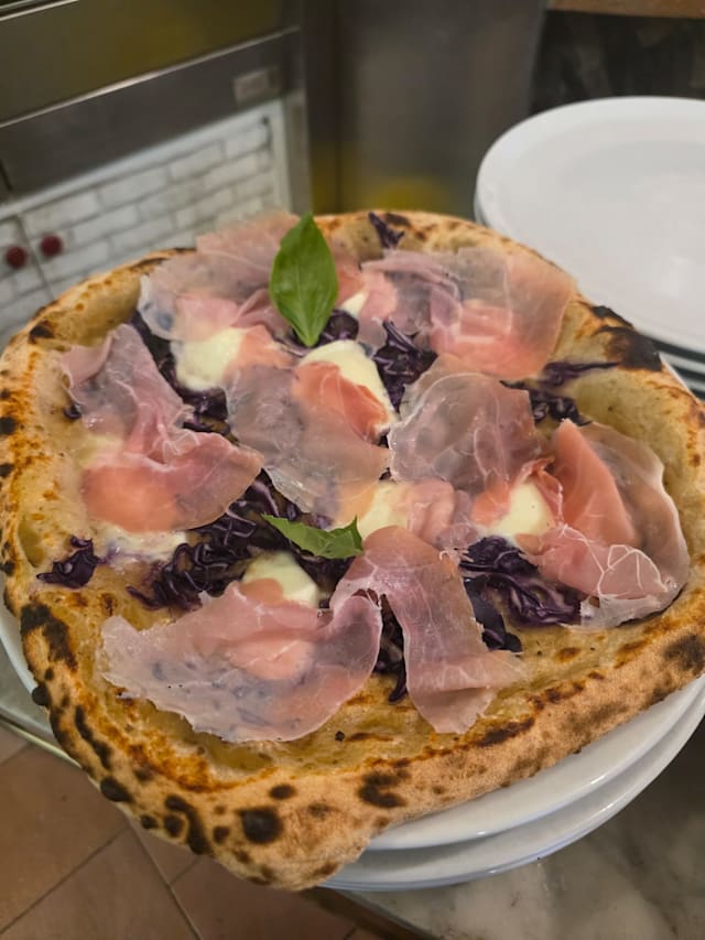 Pomodoro, mozzarella, speck in forno, rucola e scaglie di grana