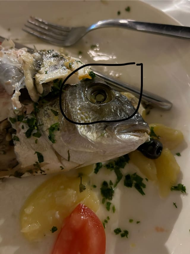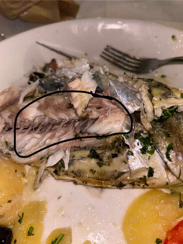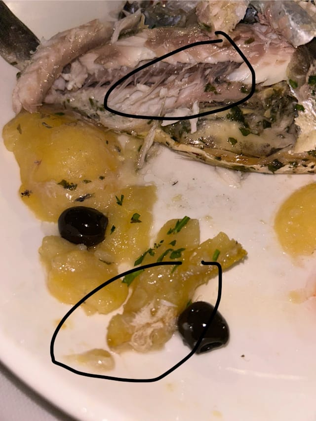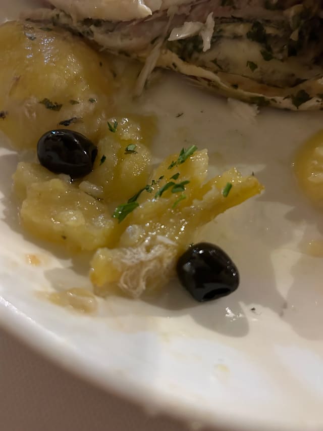Il pescato del giorno passato al forno con olive, pomodori e pinoli servito su letto di patate
