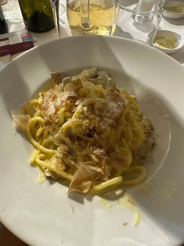 Spaghetti alla carbonara di pesce e cipolle di tropea