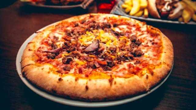 (Queso, tomate, lechuga, bacon, jamón y cebolla frita)