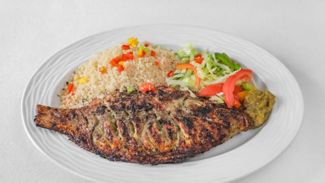 Deze schaal bestaat uit; gegrilde tilapia, lamscotelettes, kipfilet en verse garnalen