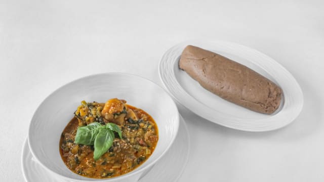 Een kom langzaam gegaarde koeienpoot, gekruid met ehuru-zaden, utazi-bladeren, eetbare potas,…