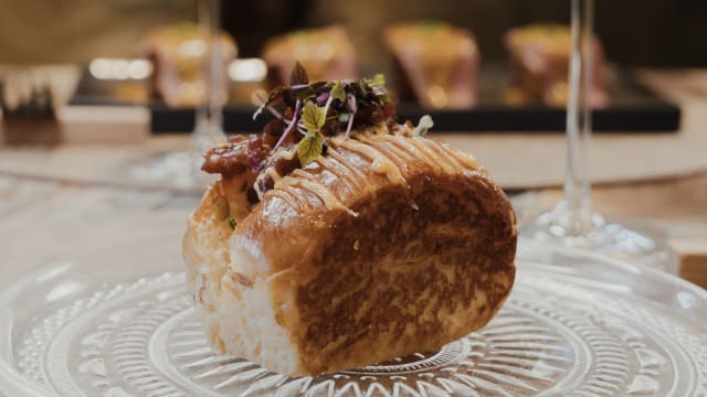 - Brioche de tartar de vaca retinta y tuétanos al humo con encurtidos y cebolleta