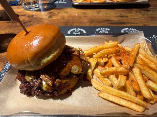 - Pan de brioche, carne de vaca tipo smash 160 gr, queso cheddar, pepinillos, salsa BBQ y cebolla morada