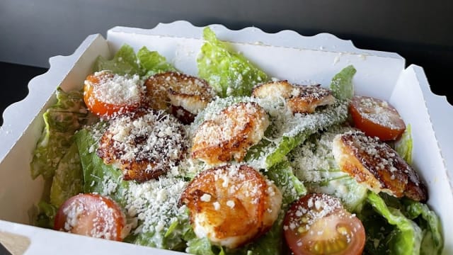 - Pollo, lechuga romana fresca, crocante y queso parmesano rallado, aderezo de césar casera y tomates