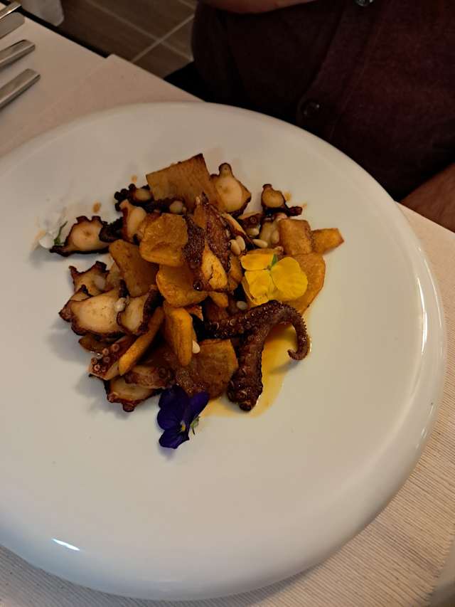 Polpo e patate rosticciate, con polvere di paprika dolce con erbe aromatiche.
