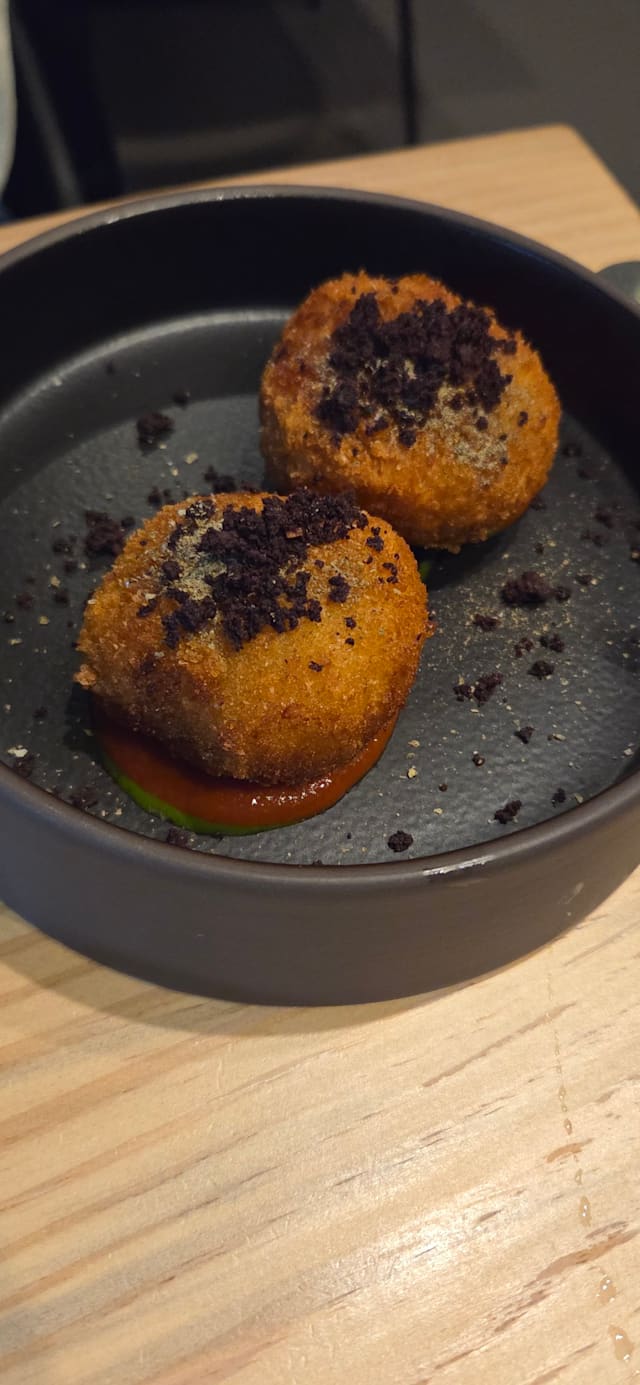 Crocchette di baccalà su crema di pomodoro grigliata e polvere di olive e capperi