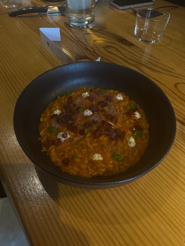 Risotto carnali con crema di peperoni arrostiti, chorizo iberico, creme fraiche e polvere di scalogno