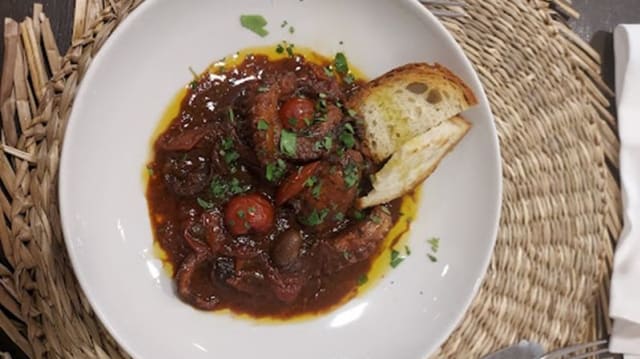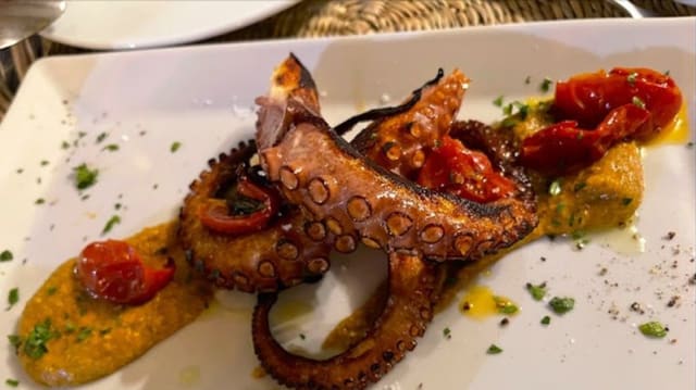 Polpo rosticciato, con crema di melanzane alla parmigiana