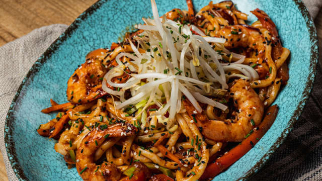 El plato nacional de Tailandia te va a flipar. Tallarines de arroz, brotes de soja, huevo, cebollino, tamarindo, cacahuete y tu proteína favorita es escoger (langostinos +1,30€ sobre el precio).Alérgenos: Pescado, sulfitos, huevo, cacahuete, frutos secos y soja.
