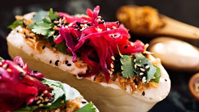 Bun relleno de pulled pork con salsa hoisin y mayonesa japonesa, hierbabuena, cilantro, albahaca y cebolla roja en escabeche. La joya de la corona.