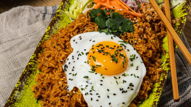 Arroz salteado con verduras, ajo y jengibre con un toque de curry y curcuma picante, verduritas frescas y coronado con un huevo frito.Alérgenos: Apio, gluten, huevo, lácteos, sulfitos, sésamo y soja.